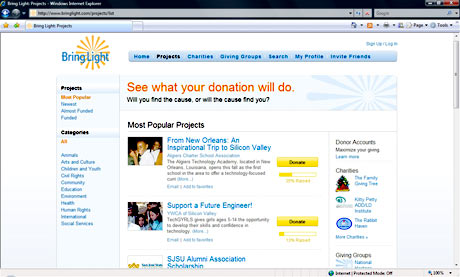 Bring Light, a charitable giving website, is the newest way to give back. The site makes it easy to donate to a wide range of worthy causes and actually see how dollars are making a tangible difference. As a social network, Bring Light lets donors meet others who have a similar desire to give and dialogue directly with charities and the community. Users can open up a Donor Account and deposit money to give at a later date, and create Giving Groups to collaborate with others to fund a specific project.