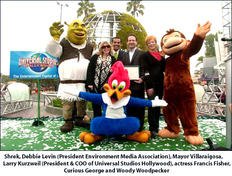 Universal Studios received the Environmental Media Association’s "Green Seal Award" on November 5th. The first theme park to ever receive this honor, their iconic steel Globe was transformed into a living plant for the occasion. The award was presented by L.A. Mayor Antonio Villaraigosa and actress Frances Fisher and helped kick start a week long series of events to promote environmental awareness.