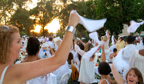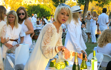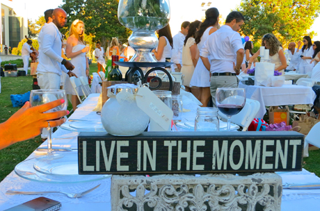 At 3 p.m. on August 25, 2012, the secret location (Natural History Museum) was revealed via email. Only those on the VIP guest list received the invite. By 6 p.m., The Black Market Trust band featuring Leah Zeger was playing and the lawn was a beautiful sight to see with hundreds of ornately adorned white tables and sophisticated Angelenos in Great Gatsby-esque attire. The feasting began as the sun was setting with a white napkin wave at around 7:15 p.m, followed by a live DJ and dancing.