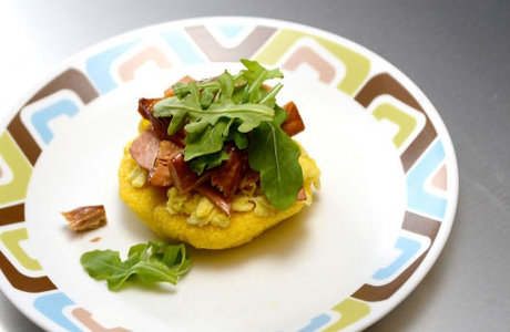 Josh was up next and explained to everyone that he had made a cornmeal cake with Canadian bacon, scrambled eggs topped with a smoked salmon.