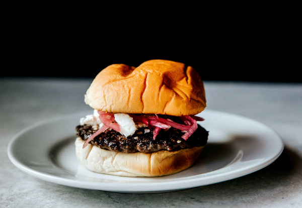 Griddle Burger with Green Sauce, Feta, Pickled Onion, and Chips