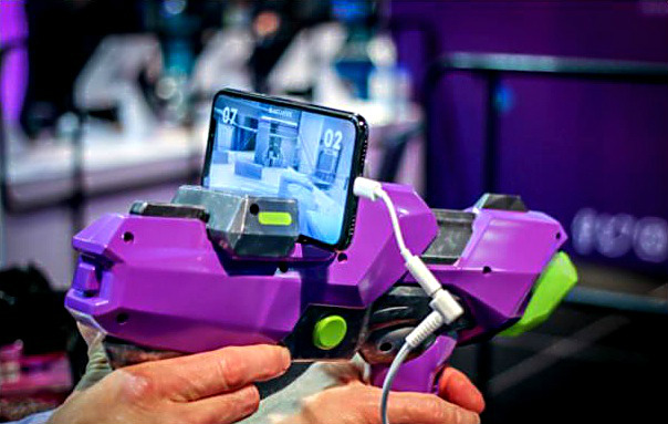 This is a blaster for virtual and augmented reality. It looks like a toy machine, but in fact, it is a kind of gamepad for a smartphone. It supports the basic positional tracking technologies, including ARKit on iOS and ARCore on Android. Using a smartphone is obligatory; you have to insert it into a special slot.