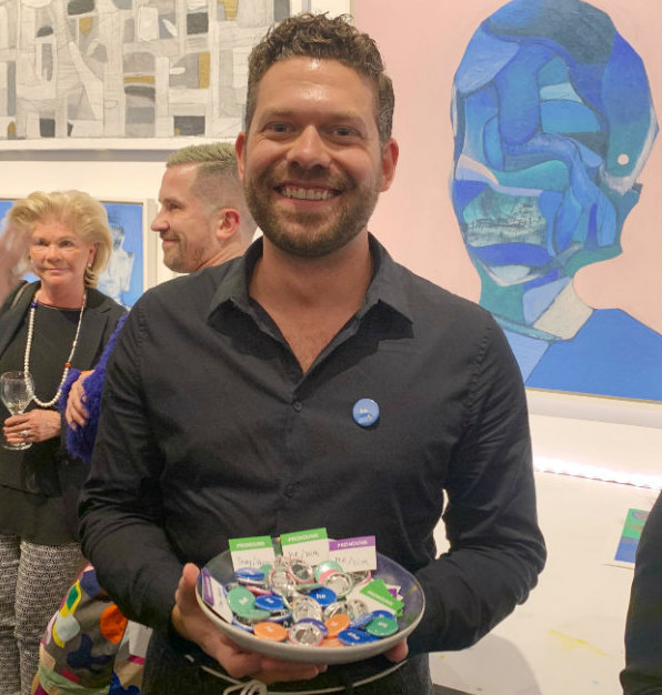 The studio space was filled to capacity with attendees supporting both the health care of trans youth and artist Marco Lorenzetto’s commitment to this important work. Those in attendance could retrieve buttons or name-tags indicating their preferred pronouns: she/her, he/him, they/them which provided a safe space and atmosphere of inclusivity.