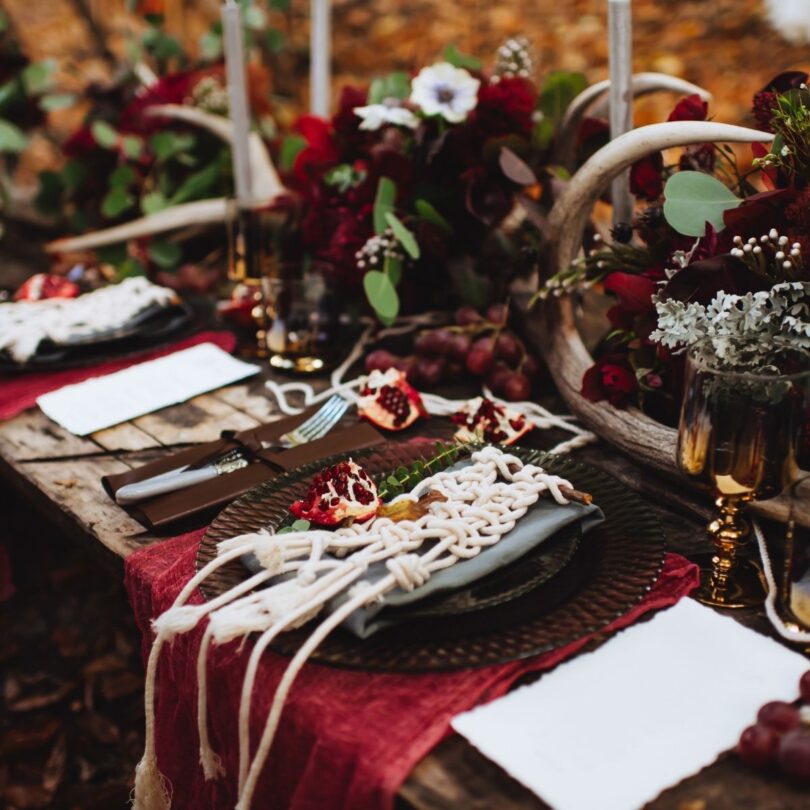Bring elements of the season straight to the table when you use fall foliage in your tablescape’s design. Purchase fake fall leaves, acorns, branches, and more from any arts and crafts store. Decorate them with elements to suit your wedding, such as glitter, paint, and textures. Remember, you still want your decor to look romantic and elegant, even if your theme is outdoors.