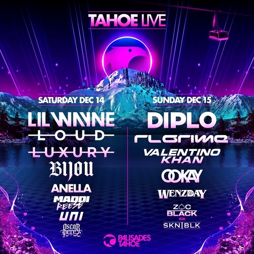 This December 14–15, Tahoe Live returns to the legendary Palisades Tahoe for its third year, offering a winter festival experience that combines world-class music with the stunning beauty of the Sierra Nevada. A festival where sound meets snow, Tahoe Live promises an unforgettable weekend featuring headliners Lil Wayne, Diplo, Loud Luxury, and RL Grime, alongside an all-star lineup of artists. Set against the majestic Sierra Nevada backdrop, the festival combines music, adventure, and the thrill of winter sports for a truly unique experience.