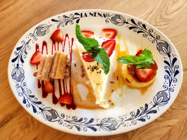 Dessert arrived as a mini sampler of house favorites. A slice of tres leches cake, churros filled with cajeta, and a smooth flan were perfect for sharing, though you may not want to.