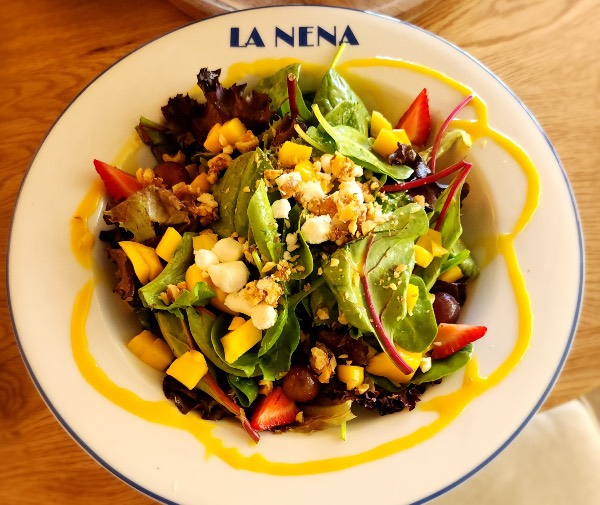 We also tried the Fajitas Mixtas, a sizzling plate of beef tenderloin, grilled chicken, peppers, onions, and tomatoes, served alongside Spanish rice and pinto beans. For something lighter, the Mango Salad offered a refreshing mix of greens, mango, grapes, caramelized walnuts, and goat cheese in a passion fruit dressing. Guests can also add protein such as shrimp, salmon, or chicken to make it a full meal.