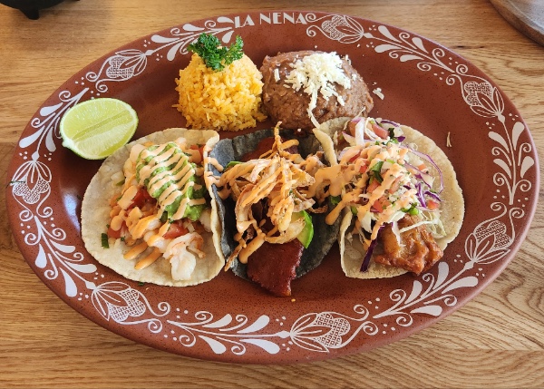At La Nena Cantina, everything is made in-house—from the tortillas to the micheladas. That attention to detail comes through in every dish.We shared the Tacos Malibu, which included a trio of tacos: baja-style fish, grilled shrimp, and zarandeado. Served with rice and beans, each taco brought something unique to the plate. The zarandeado was the clear favorite for its bold, smoky flavor.