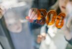 Two children decorate a window with orange stickers that spell the word "boo" and a pumpkin sticker.