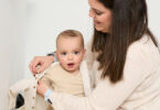 A young mother helps get her newborn dressed for the day as she places a comfortable jacket on her baby.